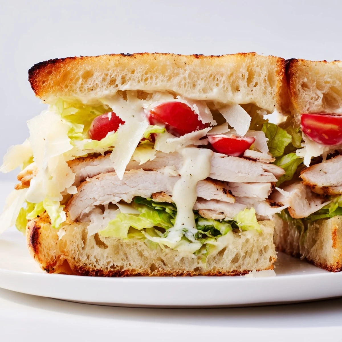 - Spread dressing generously, layer with romaine, sliced chicken, shaved Parmesan, and tomatoes if you're feeling fancy