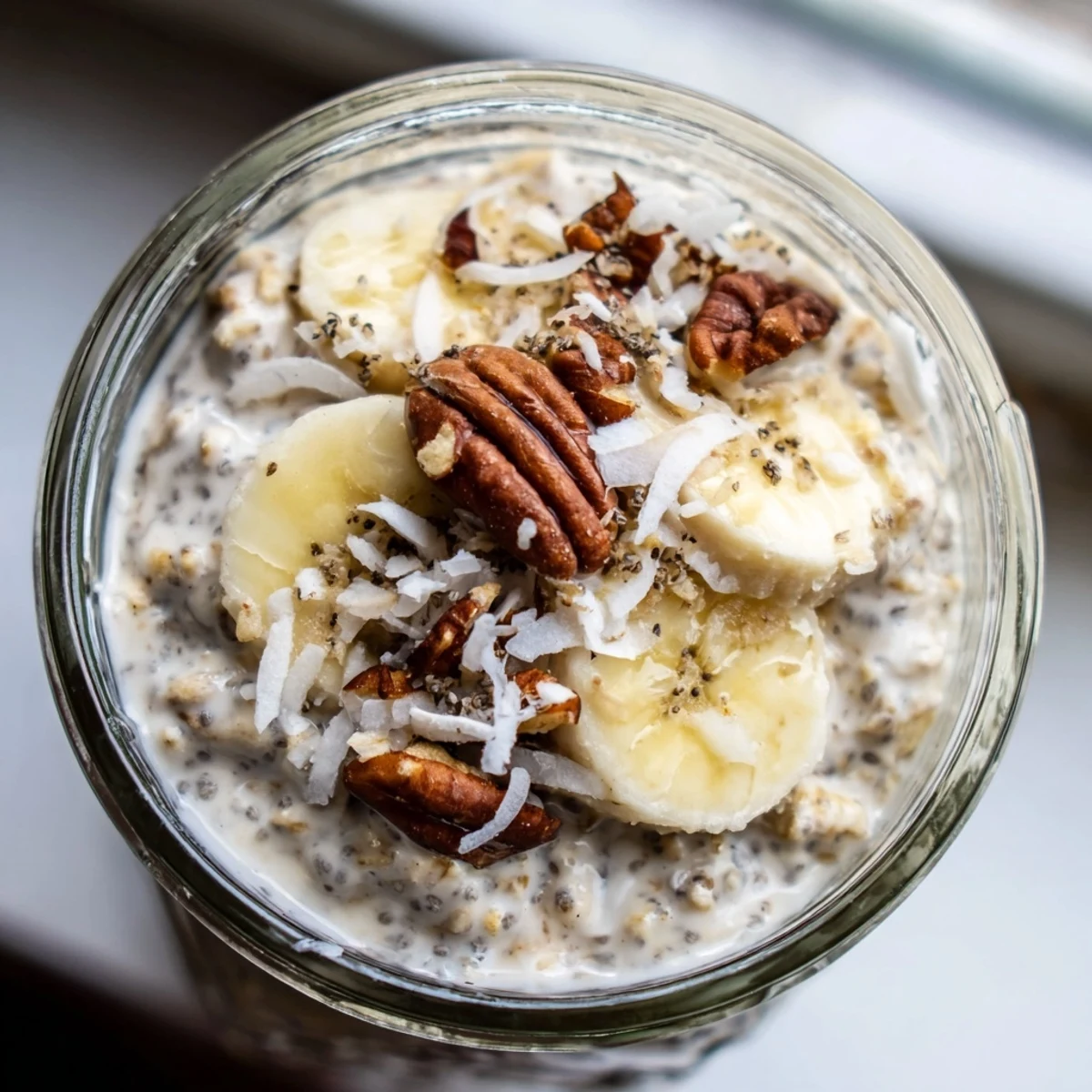 Experience the indulgent taste of coconut cream pie in a wholesome breakfast format. These overnight oats combine rolled oats with creamy coconut milk and Greek yogurt, then infuse them with vanilla and almond extracts for that signature dessert flavor. After chilling overnight, the oats transform into a luxuriously thick, pudding-like consistency. Top with toasted coconut flakes and nuts for crunch, plus fresh banana slices if desired. Perfect for busy mornings—prep in just 10 minutes, refrigerate overnight, and wake up to a ready-to-eat tropical breakfast that keeps you satisfied for hours.