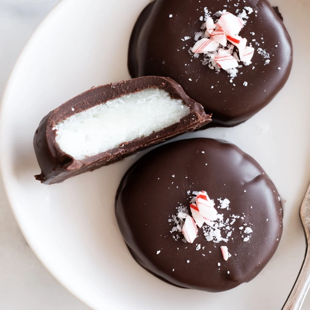 Soft peppermint filling comes from mixing sifted powdered sugar with softened butter, peppermint extract, heavy cream and a pinch of salt until smooth. Roll into small discs, freeze to firm them, then dip in melted dark chocolate (add a little coconut oil for sheen). Place on parchment and chill until set. Garnish with crushed peppermint or sea salt and store chilled.